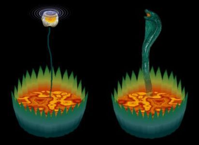 kommt eine dunkelgrüne Schlange empor. Ihr Rachen ist weit aufgerissen, das