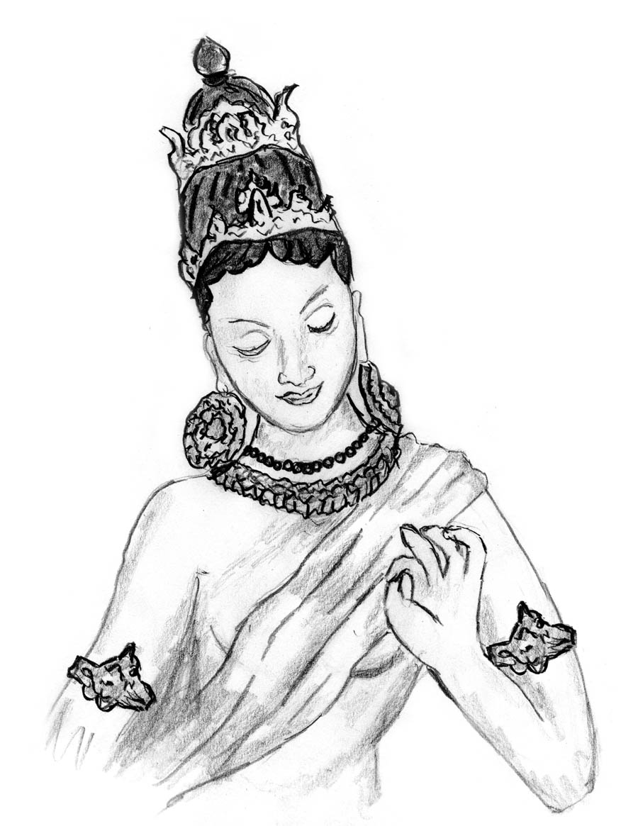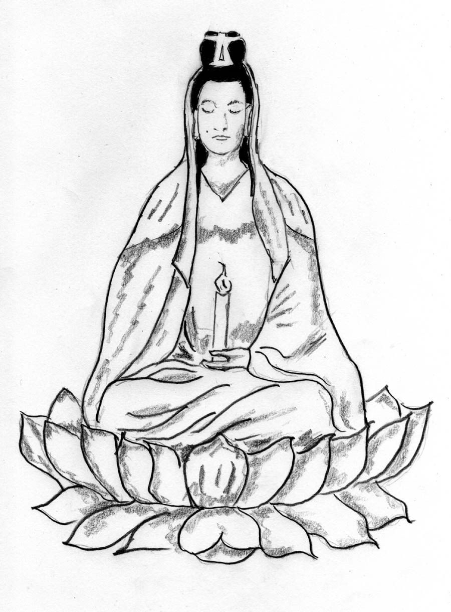 Kuan Yin, die chinesische Version von Tara, wird sehr oft in ähnlicher Haltung dargestellt, wenngleich sie statt einer Kerze eine Vase mit Amrita in den Händen hält.